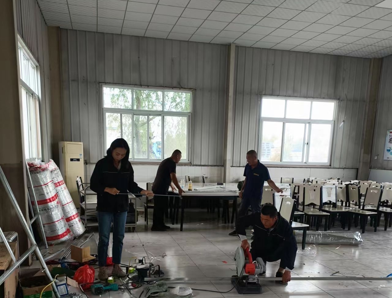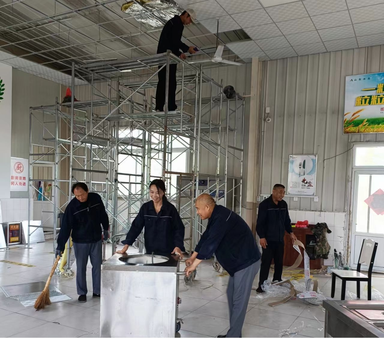 在施工现场,劳务米兰体育在线网站_米兰体育(中国) 党员干部带领员工及外聘人员对食堂进行吊顶装饰,安装吊筋、龙骨、面板,穿管线布线等。曲阜基地食堂屋顶原是彩钢瓦单层装配结构,冬不保暖、夏不隔热,有些部位已经腐蚀生锈,甚至弯曲变形。本次餐厅升级用轻钢龙骨和硅钙板加岩棉吊顶,用木质龙骨和pvs板装饰灶房,既达到隔热保温效果,又最大程度节约了成本,解决了夏天酷热、冬天寒冷的就餐问题。