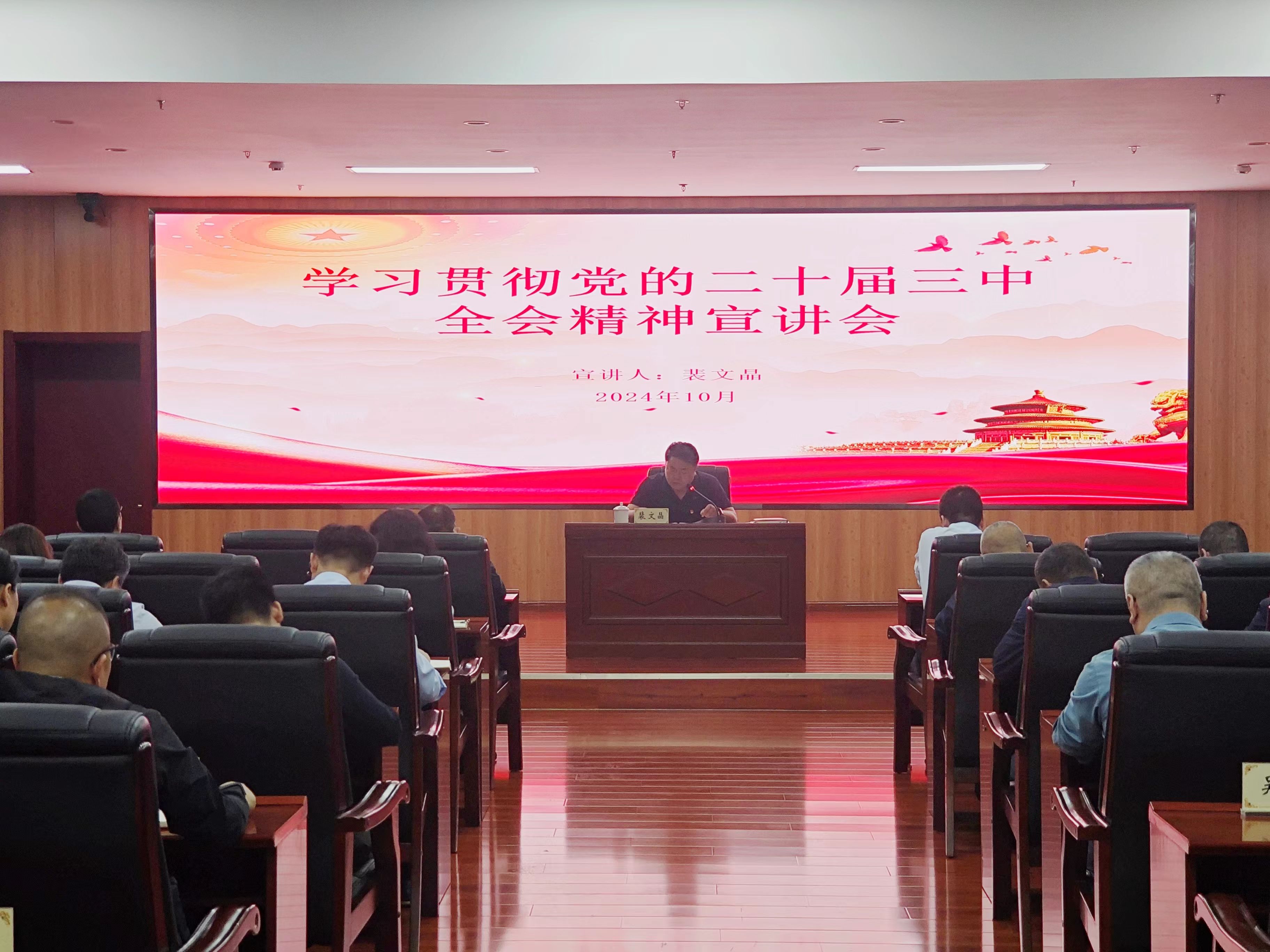 为深入学习贯彻党的二十届三中全会精神,引导广大党员干部把思想和行动统一到全会精神上来,10月12日,米兰体育在线网站_米兰体育(中国) 党委在米兰体育在线网站_米兰体育(中国) 二楼多功能厅开展党的二十届三中全会精神宣讲活动。米兰体育在线网站_米兰体育(中国) 党委书记、董事长裴文晶以“笃行奋进新征程 守正创新展作为”为题作宣讲。米兰体育在线网站_米兰体育(中国) 中层以上干部、驻济党员共60人参加宣讲。